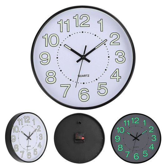 12" Night Light Wall Clock Non-Ticking Silent Luminous Black Round Glow in The Dark Battery Operated for Home/Garage/Office
