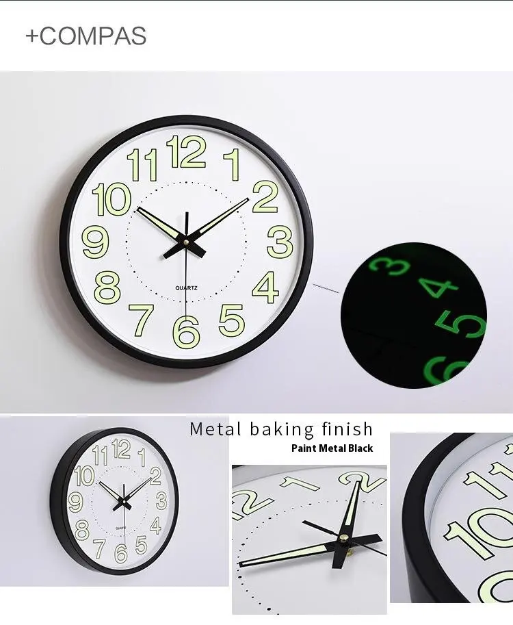3.Luminous Glow: Ensure the night light wall clock face absorbs sufficient light, like from bulbs or sunlight for about 4-8 hours, and it will glow in the dark, providing you with a soft nightlight that makes time-checking at night convenient. The glow's duration and brightness depend on the light absorbed, adding functionality to your space 24/7.